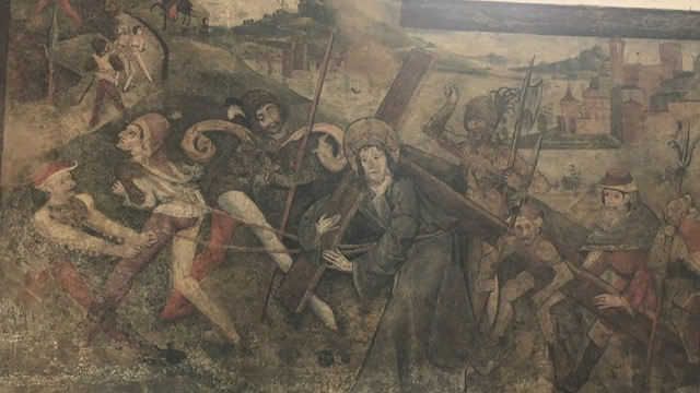 Wenn die Heilsgeschichte im eigenen Ort stattfindet … Und das tut sie, zumindest auf diesem Bild, das ihr hier seht. Hinten rechts, die Stadt, die zu sehen ist, das ist Radolfzell. Von dort kommt die Gruppe, die man im Vordergrund sieht. Und wo geht’s hin? Nach Jerusalem, nach Golgatha. In der Mitte Christus, umgeben von Menschen aus der Zeit, in der das Bild entstanden ist. Menschen, die das durchleben, die das miterleben, die das mitverursachen, was hier geschieht, was damals geschehen ist.