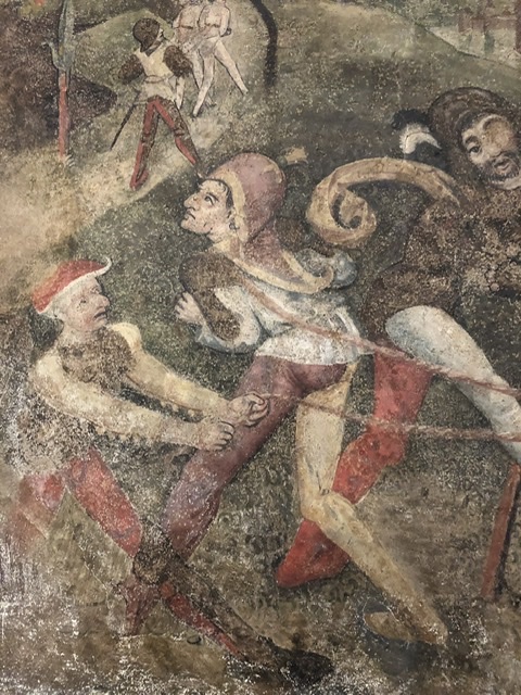 Und Christus voraus: Der Narr! Im Narrengewand, mit Eselsohr und zweifarbigem Gewand zieht er Christus zur Kreuzigung. Er verstärkt das Leid des Messias, er befördert das Leid, eventuell ist er gar der Grund warum Christus die Verantwortung übernimmt für das grad steht, was der Narr verschuldet hat.